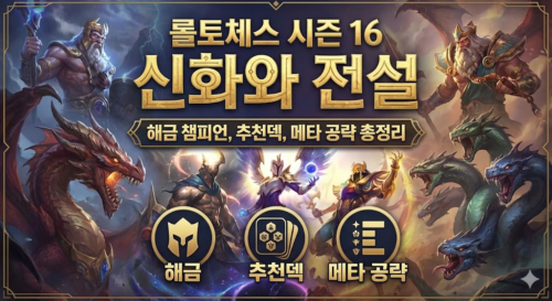 롤토체스 시즌16 ‘신화와 전설’은 해금 시스템을 통해 전략적 깊이를 한층 강화한 세트입니다. 100명의 챔피언과 350개의 증강으로 무한한 조합이 가능하며, 초반부터 빌드업을 계획하고 운영하는 실력이 승패를 좌우합니다. 더 자세한 메타 정보와 추천 덱은 아래 버튼을 통해 확인하세요.