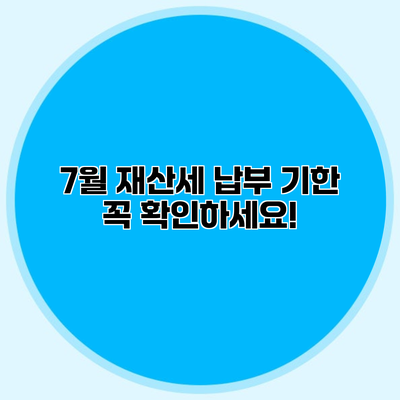 재산세의 납부 기한은 매년 7월 31일입니다. 이 날짜까지 기한 내에 납부하지 않으면 가산세가 부과될 수 있으므로, 주의 깊게 확인해야 해요.