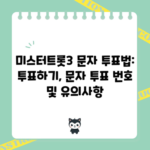 미스터트롯3 문자 투표하기 문자 투표 방법 투표 번호 유의사항 미스터트롯3에서 문자 투표하기는 참가자를 응원하는 가장 직접적인 방법입니다. 문자 투표 방법과 투표 번호, 유의사항에 대해 자세하게 설명하겠습니다. 이 글은 미스터트롯3의 팬이나 처음 응원하는 분들에게도 유익한 정보를 제공합니다. 미스터트롯3 문자 투표하기 미스터트롯3의…