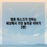 세상에서 가장 놀라운 이야기 3편 엘론 머스크 엘론 머스크의 놀라운 기술 혁신 및 지속 가능한 미래에 대한 비전을 탐구하는 포괄적 블로그 게시물입니다. 테슬라, 스페이스 X, 뉴럴링크, 더 보링 컴퍼니와의 연결을 살펴봅니다. 1. 엘론 머스크와 그의 비전: 혁신의 아이콘 엘론 머스크는…