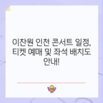이찬원 인천 콘서트 찬가 일정 티켓 예매 좌석 배치도까지 한눈에 보기 2024년, 이찬원의 콘서트 찬가가 인천 삼산월드체육관에서 열립니다. 이 글에서는 콘서트의 일정, 티켓 예매 방법, 좌석 배치도 그리고 주차 정보 등을 상세하게 설명드리겠습니다. 최고의 팬으로서 참여할 수 있는 이번 콘서트를…